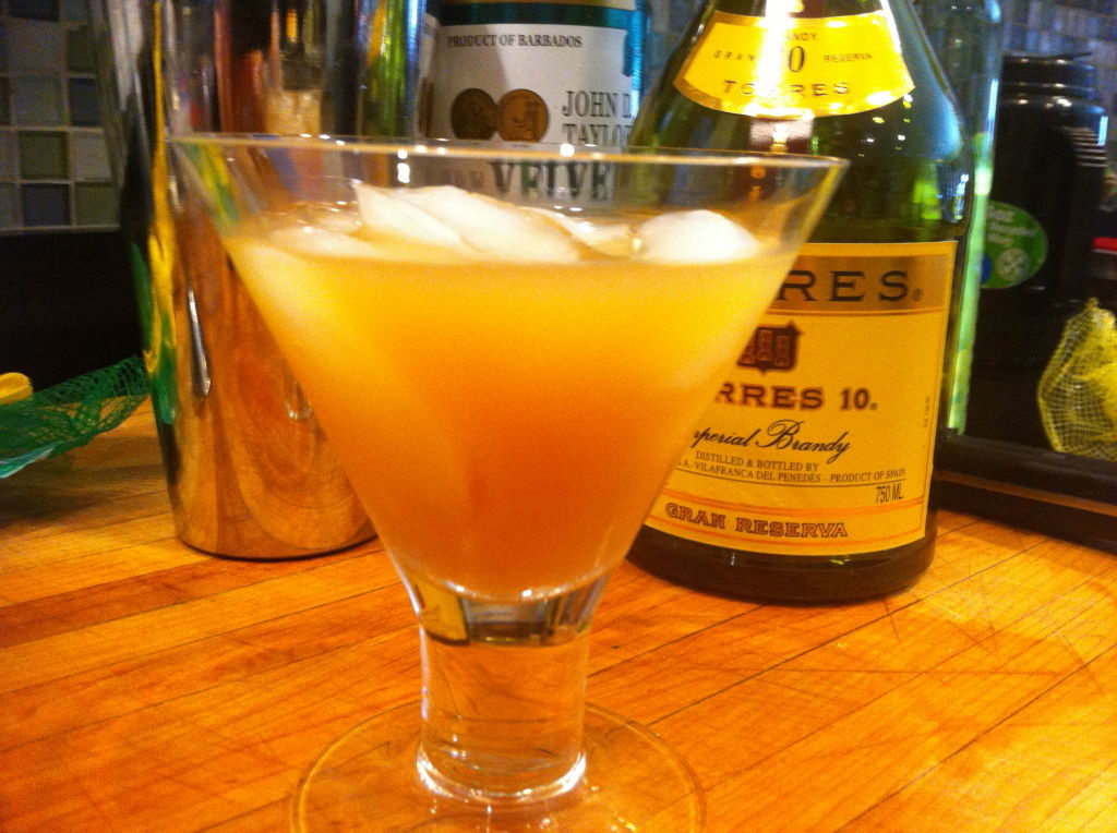 I saw a bottle of Gran Torres 10 Gran Reserva Imperial Brandy in my cabinet. I spotted a huge jug of Zeigler’s fresh apple cider in the fridge. I figured those two would work together, and the natural sweetness of the cider would mean I wouldn’t need additional simple syrup. I then thought of adding a just a small amount of Velvet Falernum, another Caribbean spirit I use sometimes when making rum drinks. I went with 1.5 ounces of the brandy, an ounce of the cider and just a trace – maybe 1/4 ounce of the falernum. Shaken over ice then poured over some nice, clean ice cubes, I finished it off with two dashes of cherry bitters. Voila! I’m calling it the Apple Jack. Cheers.