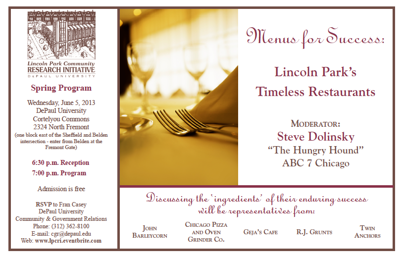 Ever wonder how some restaurants last a lifetime, and others can’t seem to make it past their 2nd birthday? As part of DePaul University’s continuing Lincoln Park Community Research Initiative, I’m going to try to find out for myself tonight. I’ll be leading a roundtable with the restaurateurs that somehow continue to make places like R.J. Grunts, John Barleycorn and Twin Anchors not only survive, but thrive. Despite the printed address on the flyer pictured above, the event has been moved, due to overwhelming demand, to the DePaul Student Center at 2250 N. Sheffield. There’s a reception at 6:30 p.m. followed by the program at 7. Hope to see some of you there tonight!