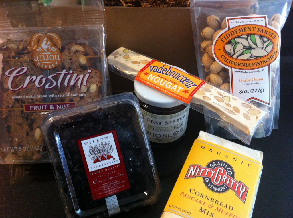 Typically, the Tasting Boxes consist of five ready-to-eat items and one “cook with” item. The November box (pictured, above) includes Willows Cranberries (dried cranberries sweetened with apple juice); Nitty Gritty Grains Cornmeal Baking Mix; Fiddyment Farms Garlic Onion Pistachios; Boat Street Pickled Figs; Anjou Bakery Fruit Nut Crostini and Vadeboncoeur Nougat Pistachio & Almond Nougat.