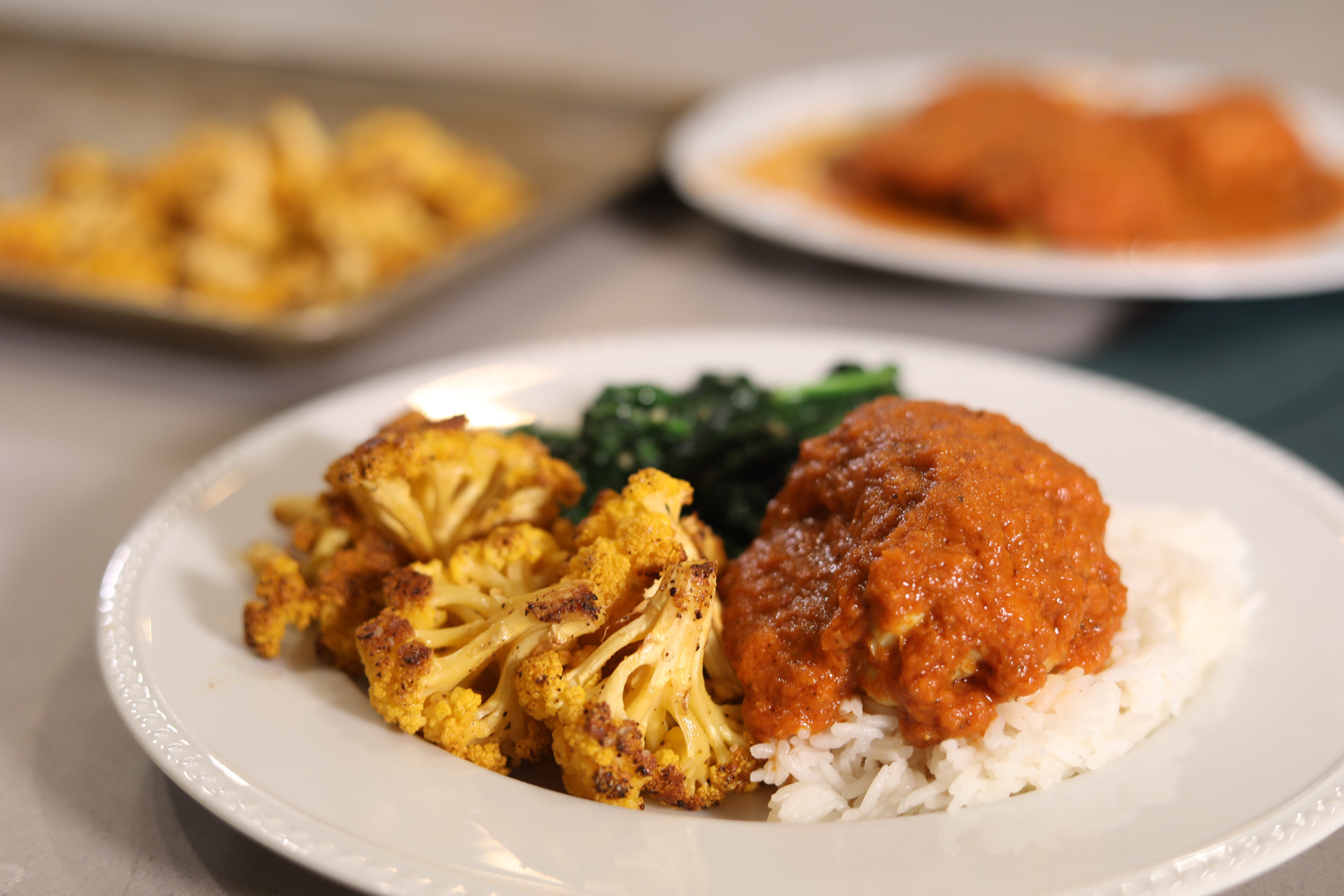 Indian-Inspired Chicken Thighs, Roasted Cauliflower and Sautéed Spinach