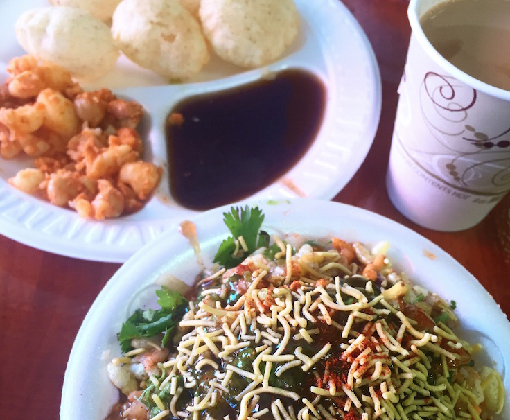 Panipuri (pictured above, background) has always been one of my favorites, ever since a trip to Mumbai more than 10 years ago. These delicate little orbs (puri) are no bigger than a golf ball. Made from wheat flour and fried until crisp, they’re completely hollow. Just tap out the top part of the puri with a utensil, then fill the crispy sphere with a mixture of chickpeas, onion and soft potatoes that come alongside. You then drizzle on a bit of sweet tamarind chutney and a thin, watery sauce embedded with green chilies (pani). Pop the entire package in your mouth for a mini-explosion of sweet, salty, crispy and starchy.
